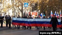 В Севастополе 4 ноября подконтрольные Кремлю власти Крыма провели демонстрацию бюджетников, пенсионеров и студентов по случаю российского праздника «День народного единства». Шествие сопровождалось песнями и маршами сталинского периода 30-50-х годов.