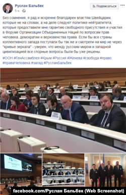 Депутат Госдумы России от аннексированного Крыма Руслан Бальбек утверждает, что принял участие в одном из мероприятий ООН, посвященным вопросам прав человека, демократии и верховенства права.