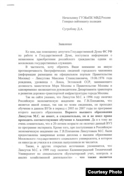 Связь между гражданством и образованием Максима Ликсутова прямая: он мог стать гражданином России в упрощенном порядке как выпускник российского вуза. В открытых источниках, в том числе в публикациях в СМИ, указано, что Ликсутов окончил два учебных заведения: Российскую экономическую академию им. Плеханова и Калининградский технический университет. Но в письме, которое Горбатов передал Кайфаджяну, утверждалось, что Ликсутов на самом деле не получал дипломов указанных вузов, а поэтому и гражданство России получил незаконно. Также там было сказано, что в Плехановскую академию по программе второго высшего образования Ликсутов поступил на основании диплома еще одного вуза – Московского государственного социального университета, в котором на самом деле не учился. Копией своего обращения на имя начальника ГУЭБиПК МВД России Дениса Сугробова Кайфаджян поделился с Радио Свобода.