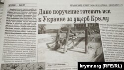 «Крымские известия» сообщают об инициативе подконтрольных России властей Крыма подготовить иск к материковой Украине за ущерб, который понес полуостров в результате «противоправных действий». Подконтрольный Москве спикер парламента Крыма Владимир Константинов дал поручение юристам и экспертам подготовить первый иск в связи с перекрытием Северо-Крымского канала и водной блокадой полуострова, призвал профильные парламентские комитеты подключиться к конкретизации объема потерь, а также привлечь к этому администрации на местах, пишет издание.