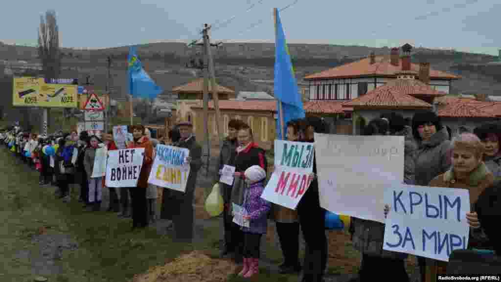Десятки тысяч крымских женщин по всему Крыму вышли на акции против войны, за мир и единство Украины 8 марта 2014 года. В почти тысяче населенных пунктах во всех районах Крымского полуострова, на тот момент уже почти оккупированному российскими войсками, они создали сотни живых цепочек вдоль крымских дорог и автотрасс с украинскими и крымскотатарскими флагами и лозунгами за мир и целостность Украины. Антивоенную акцию инициировали крымскотатарские женские организации по согласованию с Меджлисом крымскотатарского народа, однако в ней приняли участие женщины разных национальностей. Фотогалерея впервые была опубликована в марте 2014 года.