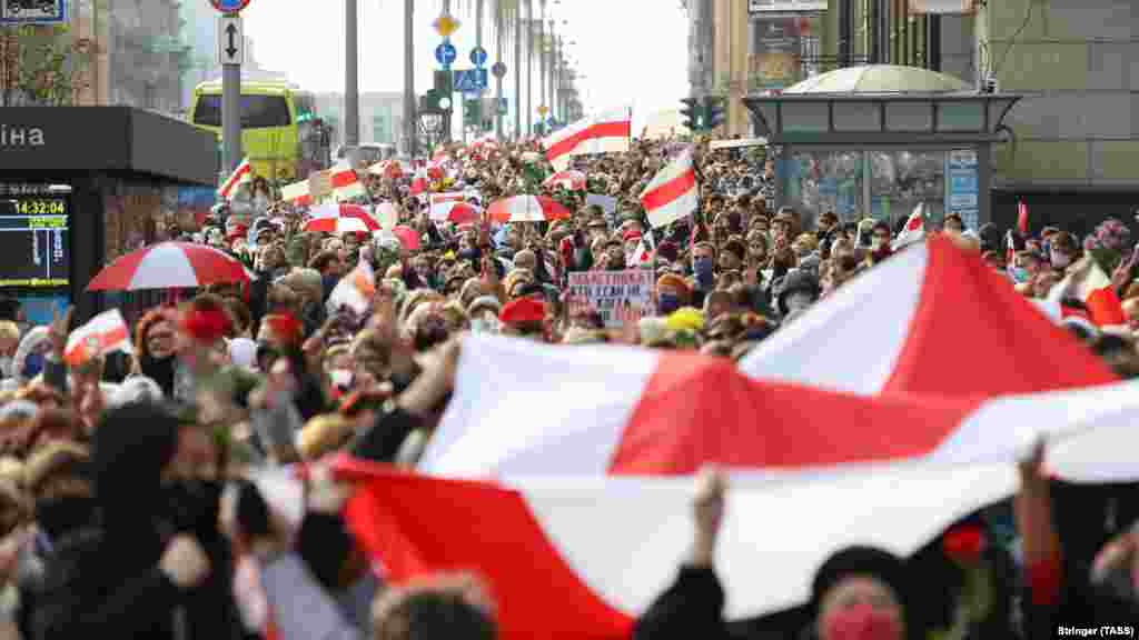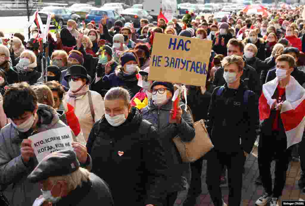 Уже традиционно по понедельникам на минской площади Независимости у костела Святых Сымона и Алены пенсионеры собрались на марш. Колонной они прошли по проспекту Независимости. К шествию присоединялись прохожие всех возрастов. Среди них много студентов, которые с утра вышли на акции протеста и поддержали всеобщую забастовку.