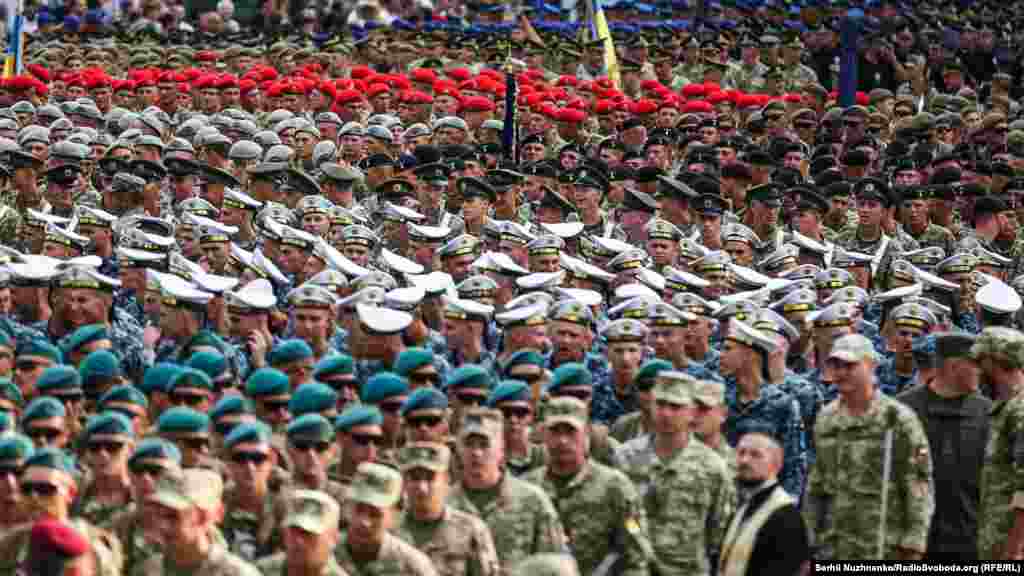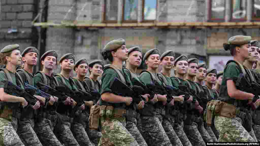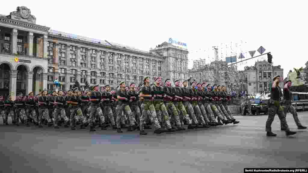 На главной улице украинской столицы – Крещатике – состоялась вечерняя тренировка личного состава, который традиционно привлекают к военному параду ко Дню Независимости Украины. В этом году страна будет праздновать 27-ю годовщину.