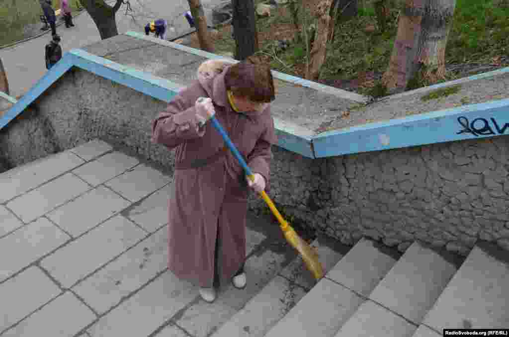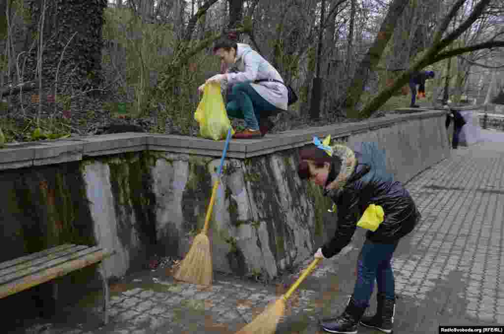 Участники уборки подметали дорожки Горсада выкрашенными в желтый и голубой цвета метлами, убирали мусор в желтые и голубые пакеты. Женщины вплетали в волосы желто-голубые ленты, а мужчины были с флагами Украины.
