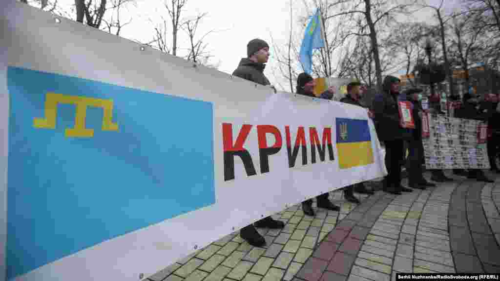 Участники акции держали в руках плакаты с надписью «Крым – это Украина», флаги Украины, крымскотатарский флаг, портреты политузников.