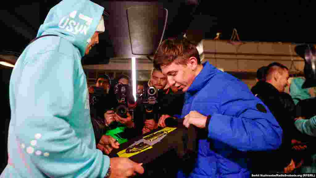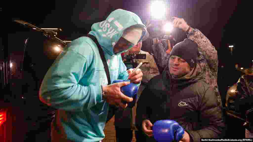 Александр Усик подписывает боксерские перчатки для фанатов бокса