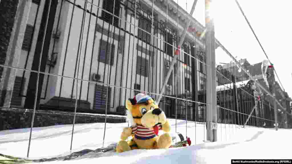 Киевляне несут цветы и игрушки к зданию посольства России в память погибших в трагедии.