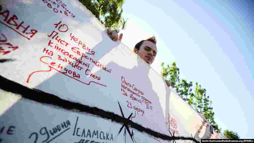 В четвертую годовщину ареста крымчан Олега Сенцова и Александра Кольченко в Киеве состоялась уличная акция. Активисты развернули баннер, на котором черным цветом были отмечены главные мировые события, а красным – события из жизни Сенцова и Кольченко, успевшие произойти за эти четыре года.