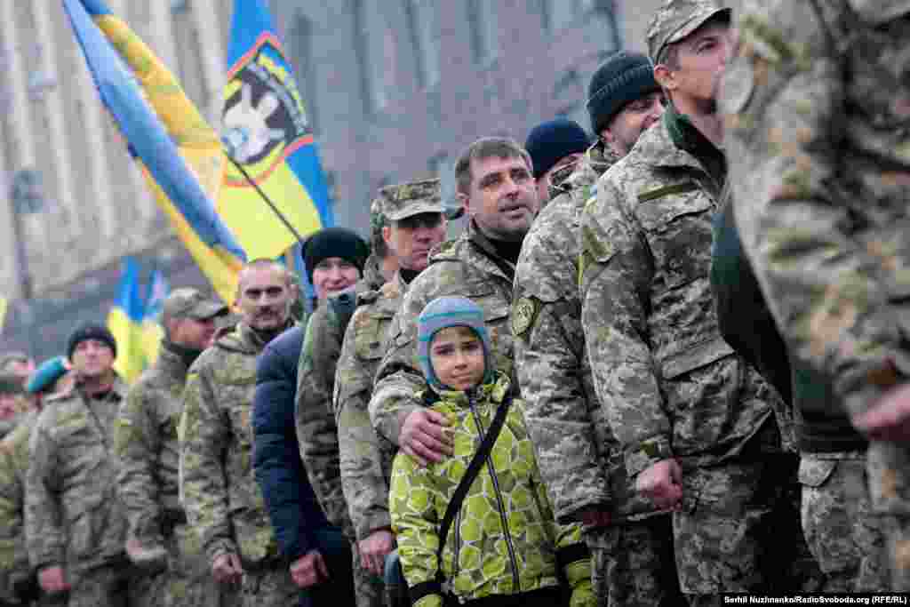 На центральной улице Киева собрались ветераны боевых действий на востоке Украины, участники обороны Дебальцевского плацдарма, чтобы маршем почтить вторую годовщину боев за Дебальцево