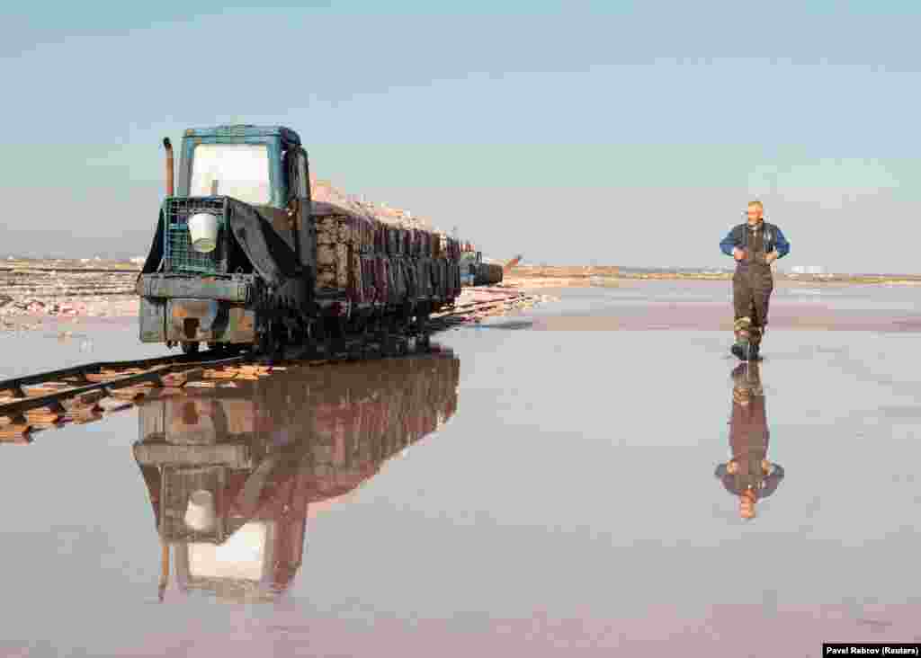 Работник проходит мимо фургона, загруженного розовой морской солью на озере Сасык-Сиваш, недалеко от Евпатории