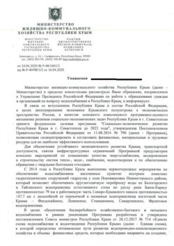 А тем временем российские власти Крыма утверждают, что «общие ресурсы поверхностных и подземных источников Крыма достаточны для питьевого и хозяйственно-бытового водоснабжения при условии реализации запланированных мероприятий, предусматривающих строительство систем водоподачи, бурение разведочно-эксплуатационных скважин, а также реконструкцию и техническое перевооружение гидротехнических сооружений».
