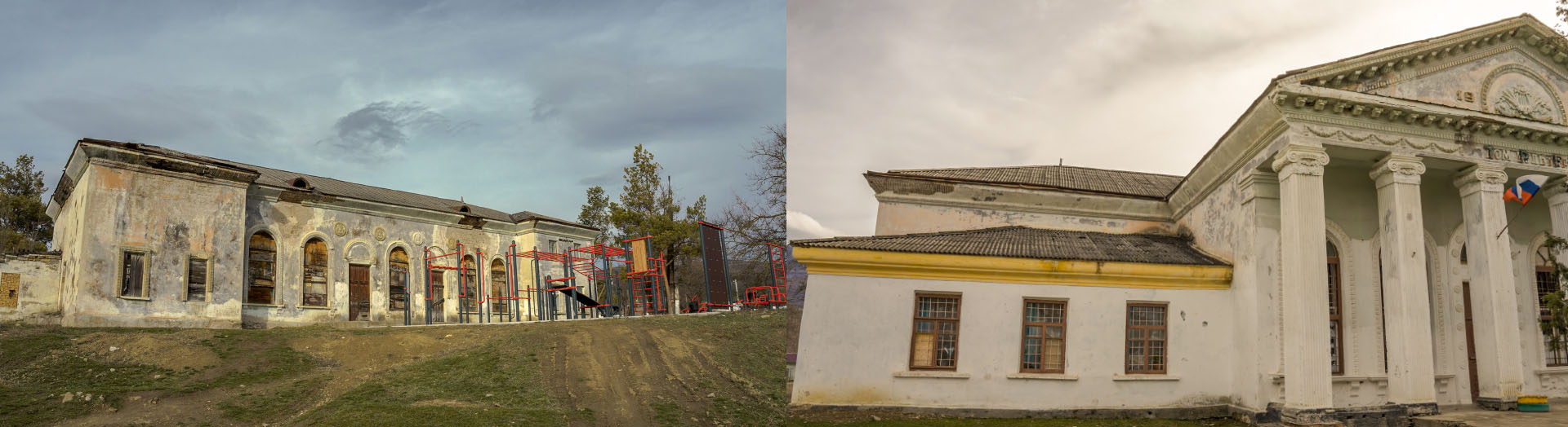 Самое старое здание Плотинного (слева) и бывшая школа (справа). Когда-то эта школа была религиозной, позже – светской. После закрытия школы здесь расположился ФАП