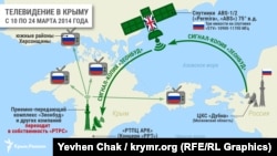 В 2014 году телевизионное вещание в Крыму было аналоговым и цифровым – в формате Т2. Из передающего центра в Киеве украинские телеканалы поднимались на европейский спутник Astra-1G (31,5° в. д.), а наземное оборудование принимало этот сигнал, после чего он раздавался через сеть эфирных передатчиков в цифровом формате Т2, и, в конце концов, оказывался на телеэкране крымчан.