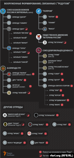 Журналисты "Системы" выявили более 20 различных отрядов, которые нанимают людей через так называемую ЧВК "Редут". Среди них группировки, связанные с 16-й бригадой спецназа ГРУ (упомянутые выше "Волки", а также "Тигры"), казачьи формирования ("Листань" и "Скиф"), подразделения "Союза Добровольцев Донбасса" ("Бригада Святого Георгия") и отдельные формирования вроде "Трои" и "Ветеранов". Кроме того, до конца 2022 года по системе "Редут" комплектовалась неонацистская группировка "Русич".