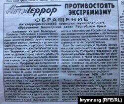 Силовикам и местным российским властям это очень не нравится, они ищут все новые пути, чтобы подавить мирное сопротивление в Крыму. В каждом районе созданы «Антитеррористические комиссии», которые работают в помощь силовикам. Так, в газете «Сельская новь» от 15 июня опубликовано очередное обращение данной комиссии, где жителей откровенно призывают к доносительству.