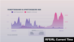 Криптокошелек ФБК прозрачен в части переведенных на него средств: с начала президентской кампании Навального и до сегодняшнего дня жертвователи отправили ему 666 биткоинов. Вторая кривая на графике – это курс криптовалюты. Учитывая, как сильно он менялся, любой пересчет в доллары или другую валюту будет некорректным. Чтобы точно подсчитать эту величину, надо знать, когда именно в ФБК использовали донаты. Но в любом случае это крупная сумма. И кто эти деньги команде Навального перевел, спецслужбы выяснить не могут.