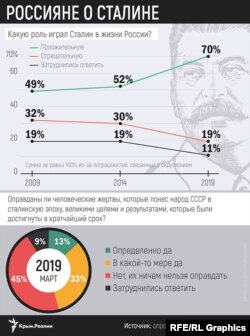 Кандидат социологических наук, научный сотрудник российского «Левада-Центра» Карина Пипия напрямую связывает рост симпатий к Сталину с аннексией Крыма.