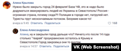 Другие севастопольцы и крымчане обсуждают рекомендацию российских властей оставаться дома. «Оставаться дома? В смысле? С какого мы теперь все должны дома сидеть? Так а если на дом упадёт, тогда где оставаться? Бред. От судьбы все равно не уйти. Не запугивайте людей. Начинается», – возмущается Тамара Кратова.