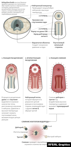 "Царь-бомба" – это водородная, или термоядерная, авиабомба; это более сложная и мощная модификация атомной бомбы. В атомных бомбах применяется уран или плутоний, в водородных – еще и изотопы водорода дейтерий и тритий.