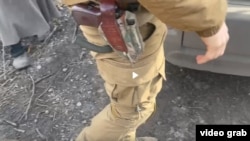 На этом видео «благодетельствует» человек в каске и разгрузке с запасными магазинами к автомату.
